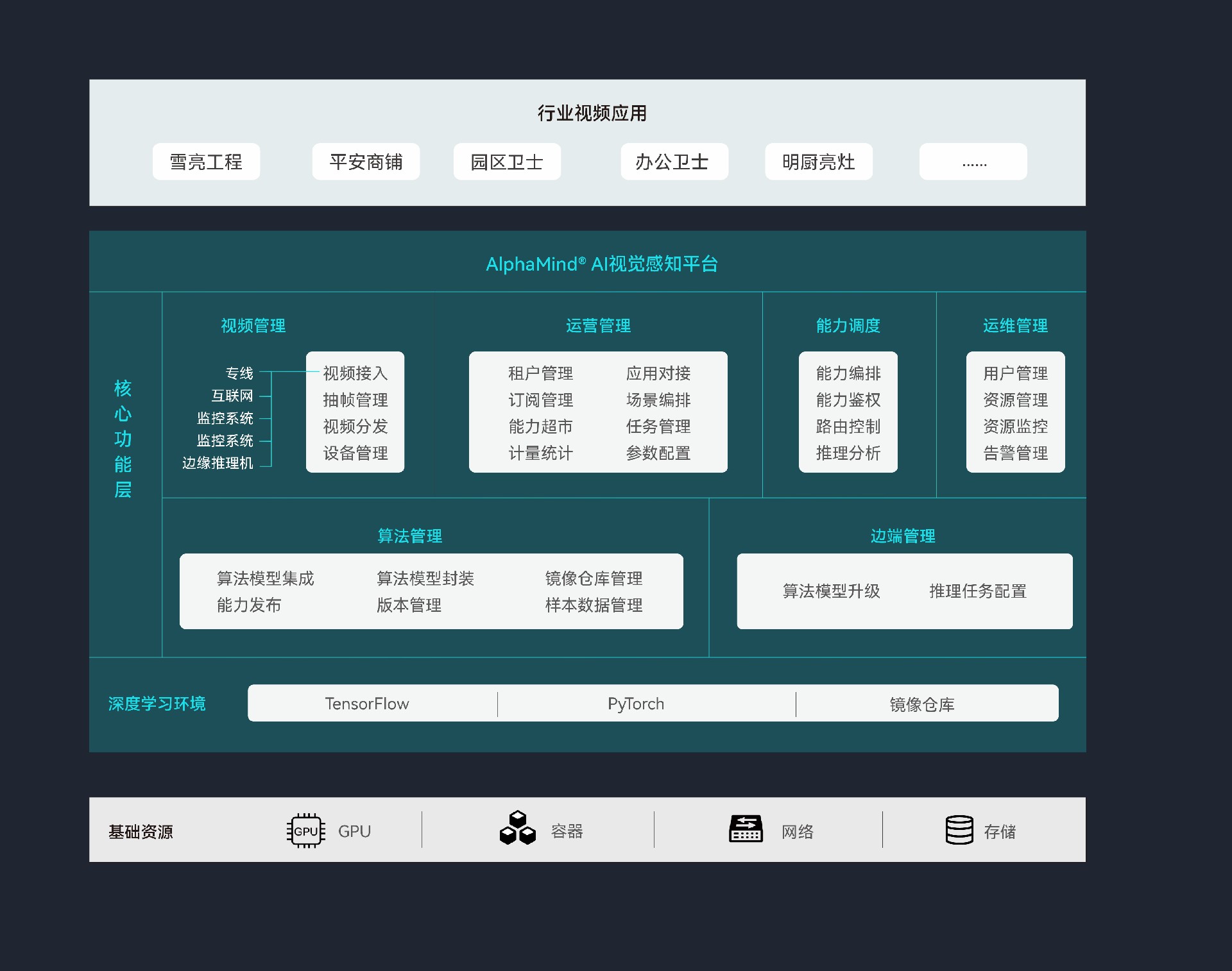 AlphaMind® AI视觉感知平台包括深度学习环境和核心功能层两部分,是云原生、容器化架构的平台,它对视频AI能力进行统一汇聚、封装、调度,支持算法本地部署和远程调用方式,支持云边视频智能分析模式。